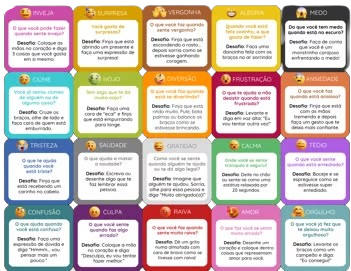 40 Perguntas Curiosas e Desafios emocionantes para se expressar usando corpo, rosto, voz, movimento e imaginação. Estimula comunicação e expressão emocional. Uma brincadeira que transforma sentimentos em movimento através da arte e da criatividade!